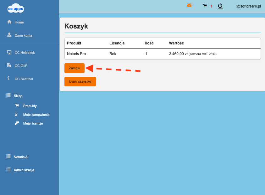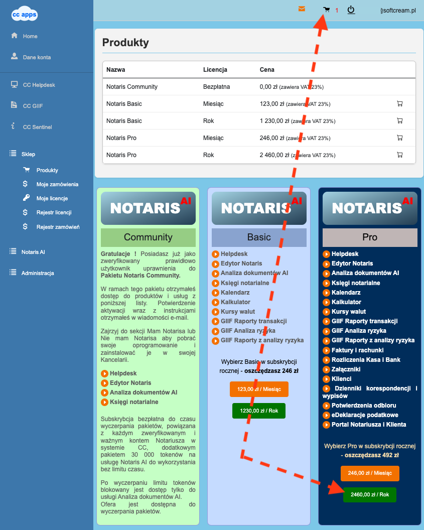 1️⃣ Wybierz subskrypcję z oferty Notaris i dodaj ją do koszyka.