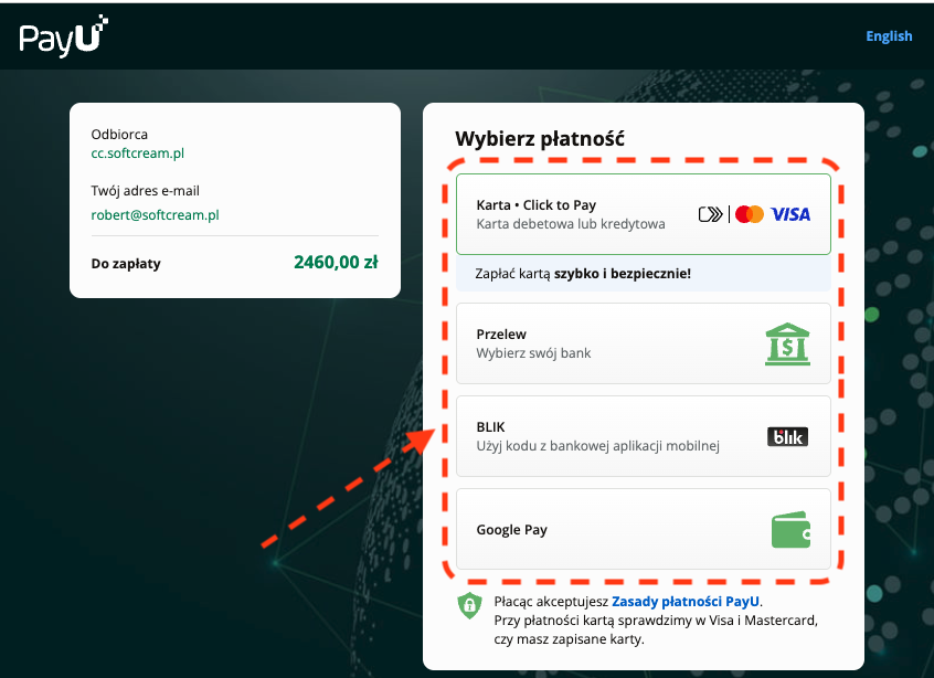 4️⃣ Wybierz formę płatności w systemie PayU – przelew, karta lub BLIK.