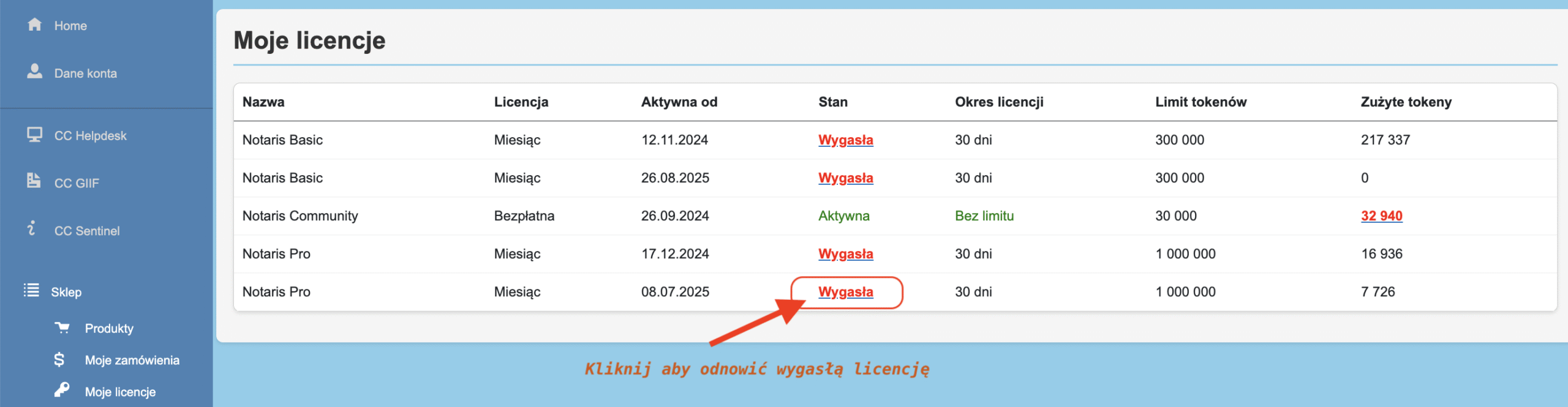 • Uruchom Notarisa kliknij na ikonkę Notaris AI i Moje Licencje kliknij na licencję, która wygasła.