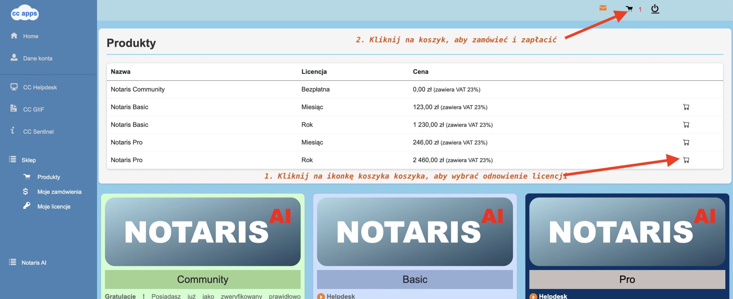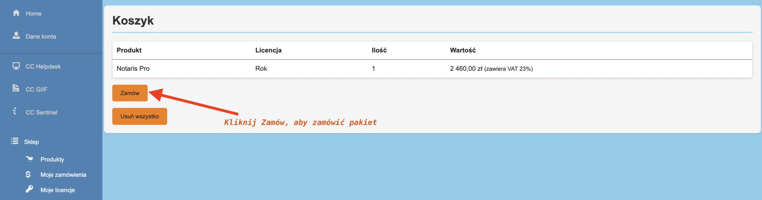 • Kliknij na koszyk przy Twoim wybranym pakiecie licencyjnym np: 💼 Notaris Pro – 2 460 zł/rok. W ten sposób dodasz do koszyka wybrana subskrypcję licencji.