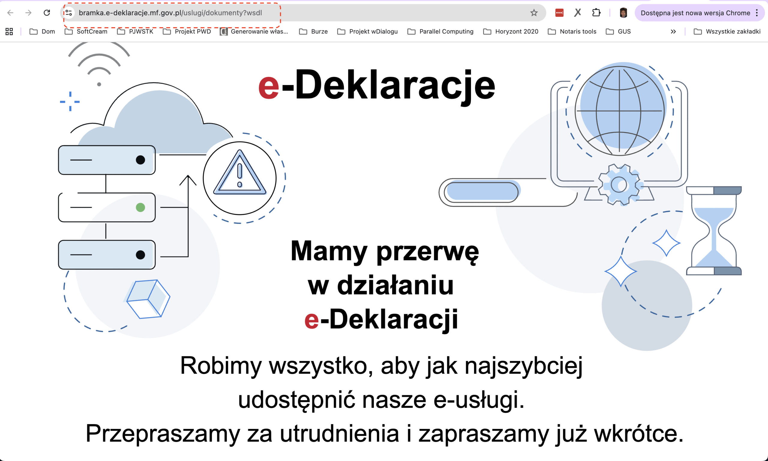 W związku z awarią nie jest możliwe wysyłanie deklaracji podatkowych oraz odbieranie potwierdzenia odbioru UPO również a aplikacji Notaris / iRejent